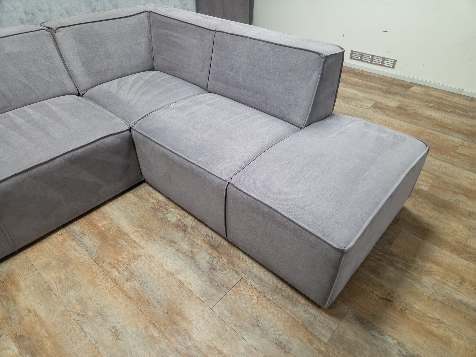 Deze hoekbank verkeert in uitstekende staat en biedt optimaal zitcomfort. De moderne grijze bekleding maakt hem een stijlvolle toevoeging aan elk interieur. Perfect om te ontspannen met familie of gasten.